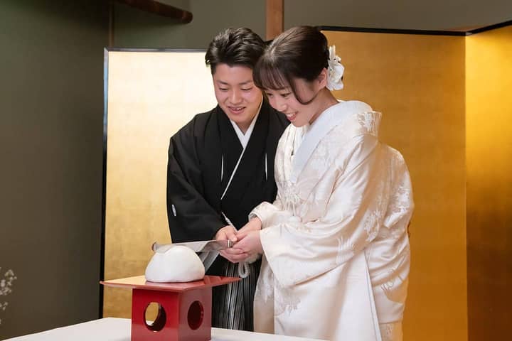 和の雰囲気に合わせてケーキではなくお饅頭にしました。夫婦で協力して正確に切ることで中に入った小さなお饅頭の断面がきれいに現れます。一般的なケーキ入刀以上に「共同作業」である必要があり、上手に切れるか緊張しましたが、会場全体で盛り上がることができました。