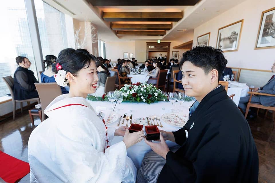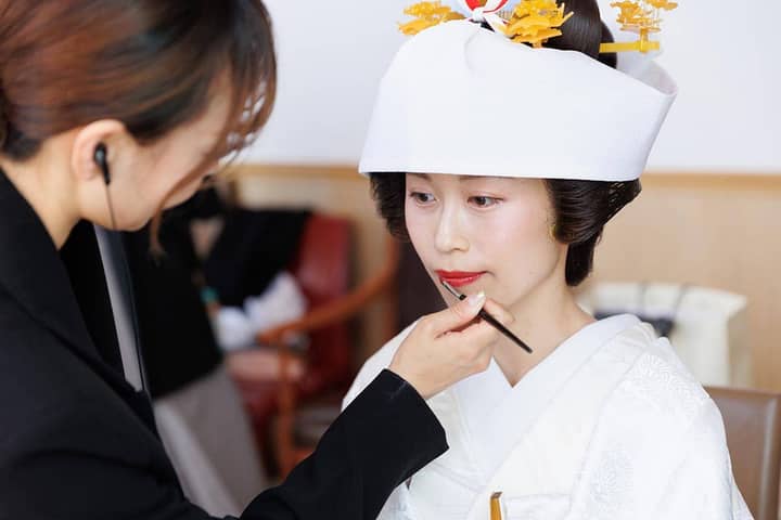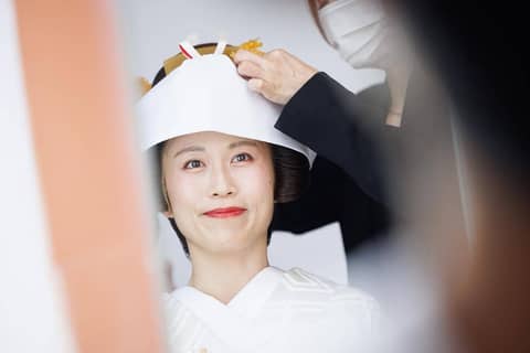 挙式時は鬘と角隠しをつけれ行い、披露宴では会場の雰囲気に合わせて洋髪にしました。