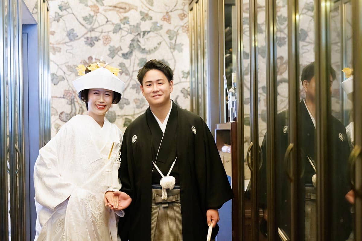 挙式時は鬘と角隠しをつけれ行い、披露宴では会場の雰囲気に合わせて洋髪にしました。