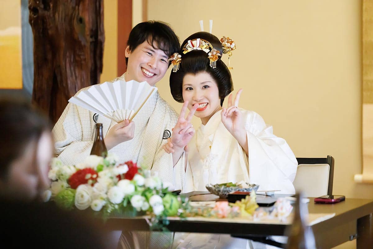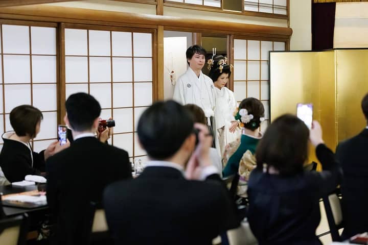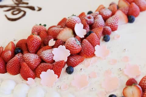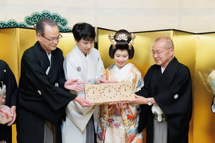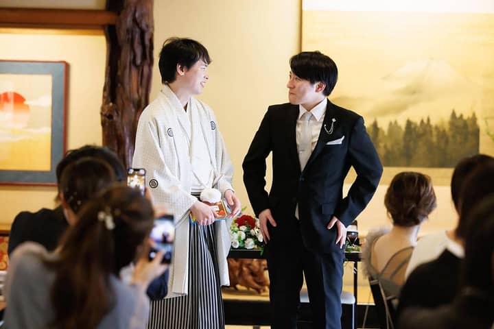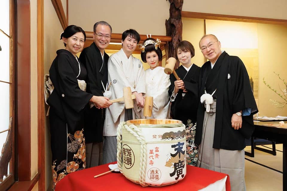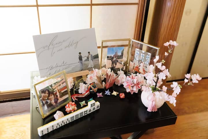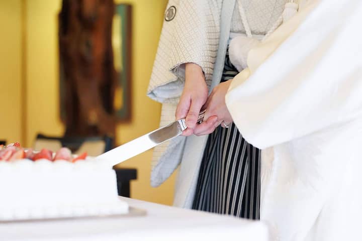 せっかく来ていただくゲストの方々の中にも和の披露宴を経験した事のある方は少なかったため、思う存分「和」を満喫してもらいたいと思っていました。そこで、席札はお米の入った袋に名前を書いたものを用意したり、テーブルの装飾も折り紙で作られた毬や鶴、亀などを用意し飾り付けてもらいました。ケーキ入刀も桜をイメージしたデザインにし、また酒樽を木槌で割る鏡開きも行い日本酒をふるまうなど和の心を散りばめてみました。
